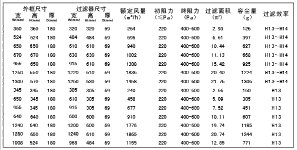 可更換式一體化高效過濾器型號尺寸及其它參數