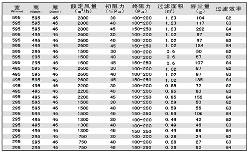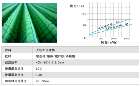 外框材質;鋁型材/鋁板折框/鍍鋅框/不銹鋼框/紙框、濾料材質、合成纖維、護網材質、鍍鋅電焊網/鋁網/不銹鋼網過濾效率 G1:40%@2.0μm,G2:65%@2.0μm, G3:85%@2.0μm, G4:90%@2.0μm使用最高溫度80℃,使用最高濕度100%。